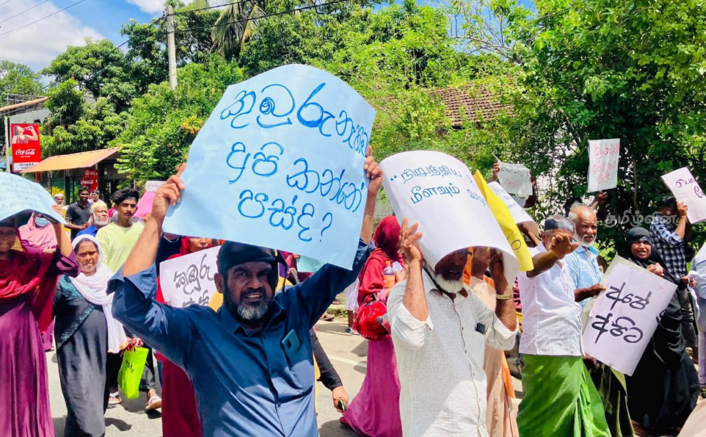 Farmers from Muthunagar and Kinniya in Trincomalee staged a protest march coinciding with Sri Lankan president Anura Kumara Dissanayake’s visit to the district for an event at the occupying air force base. Courtesy: Tamil Guardian